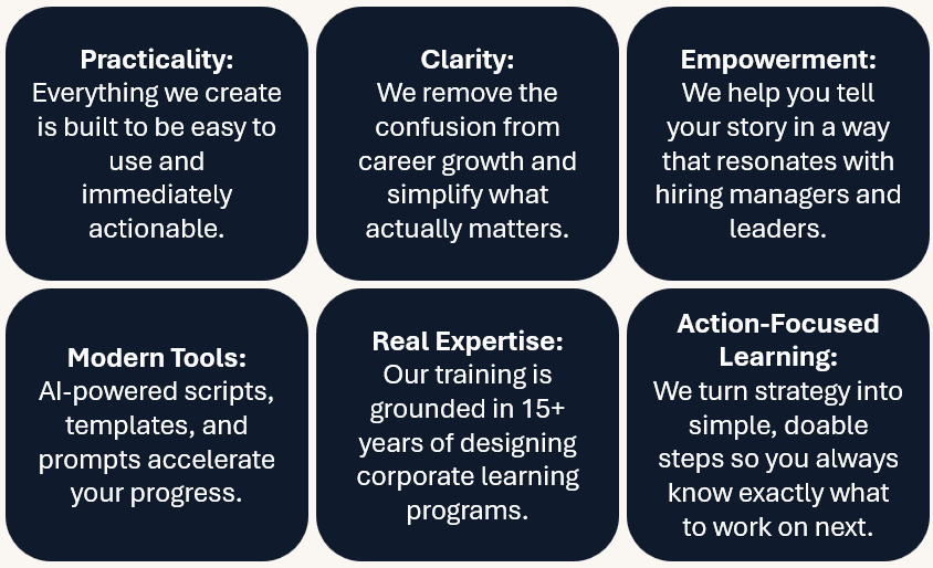 We take 15 years of corporate learning experience and combine it with practical, actionable frameworks - and the power of AI - to help you show up professionally in a way that finally works.